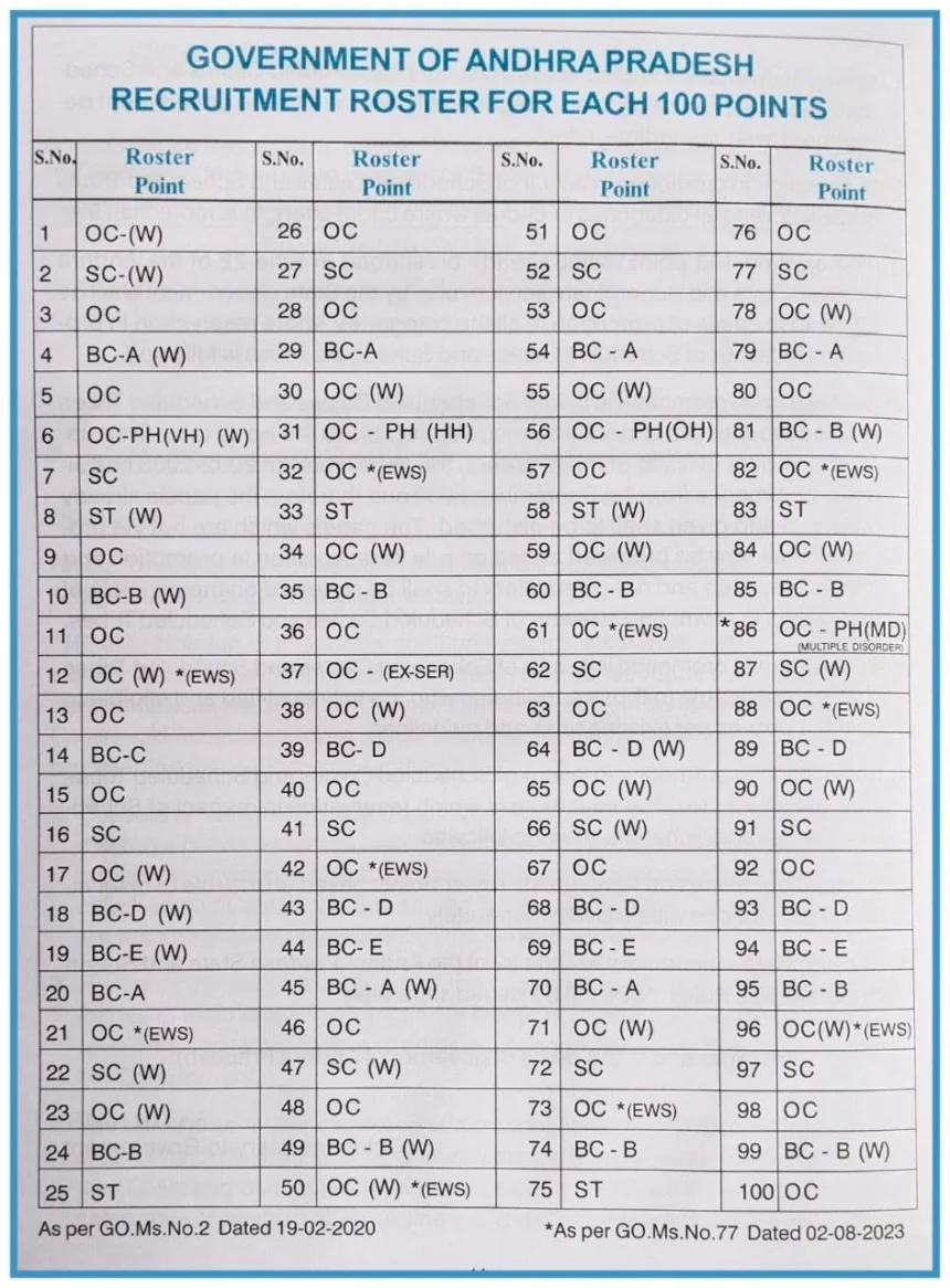 | S.No. | Roster Point | S.No. | Roster Point | S.No. | Roster Point | S.No. | Roster Point |